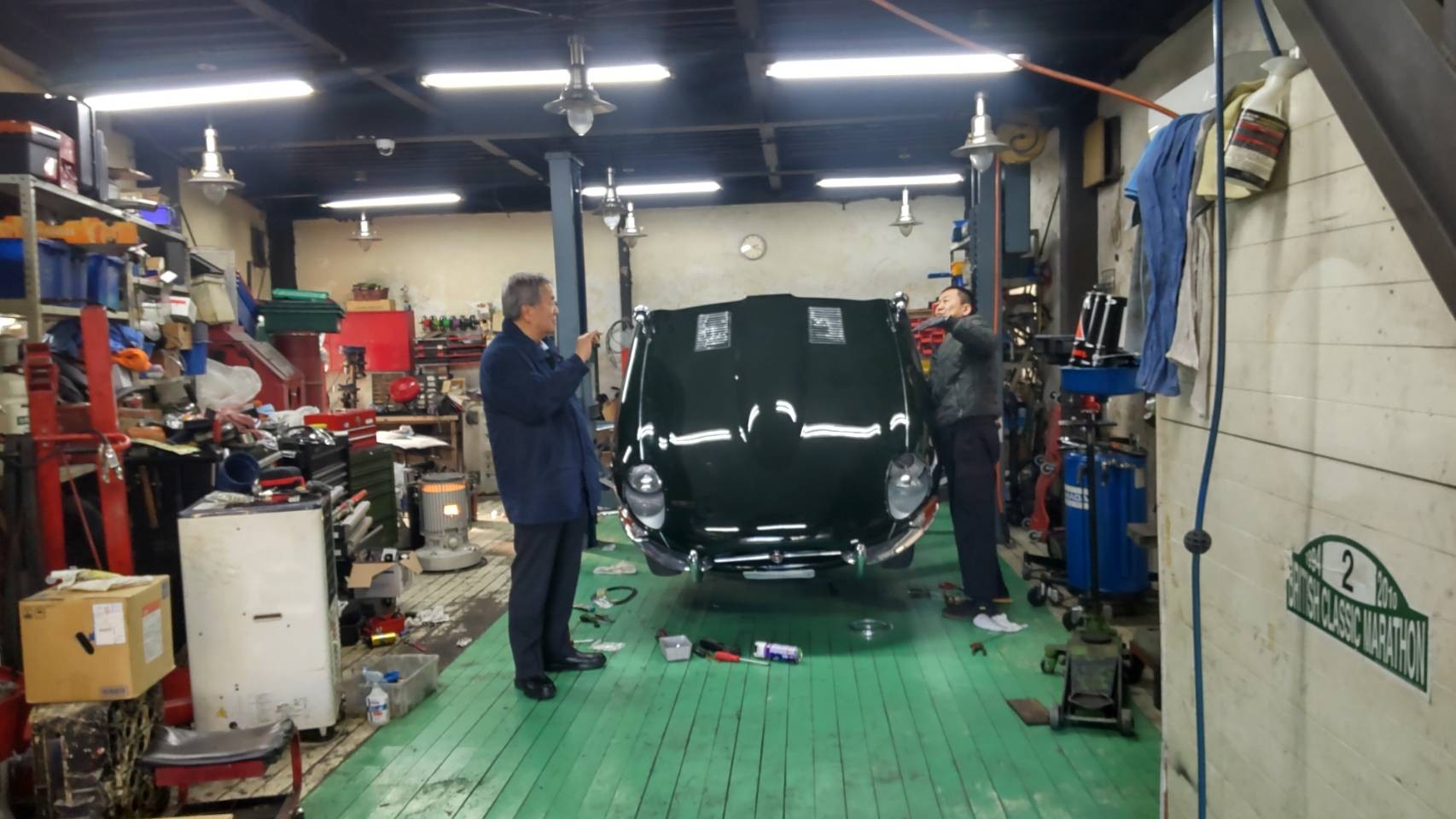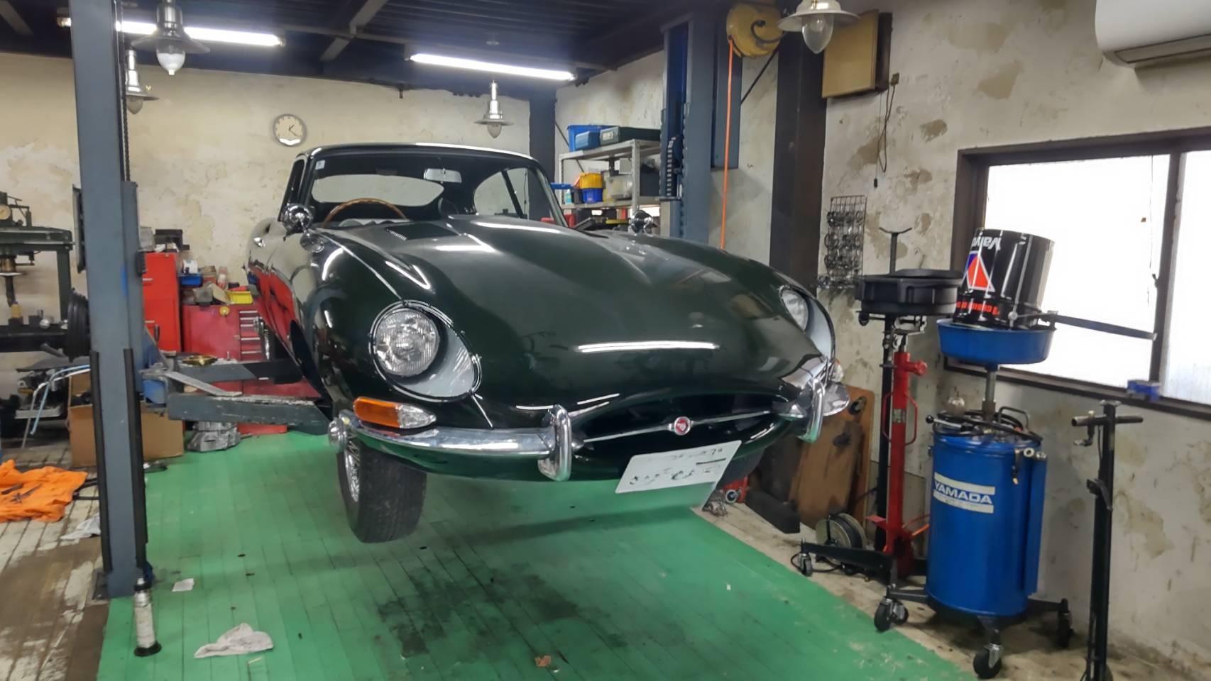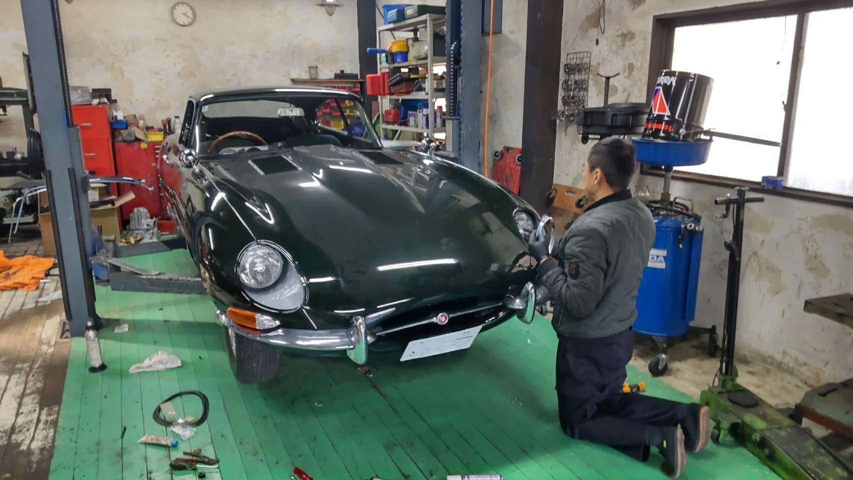 外装パーツ取り付け中のJAGUAR E-TYPE